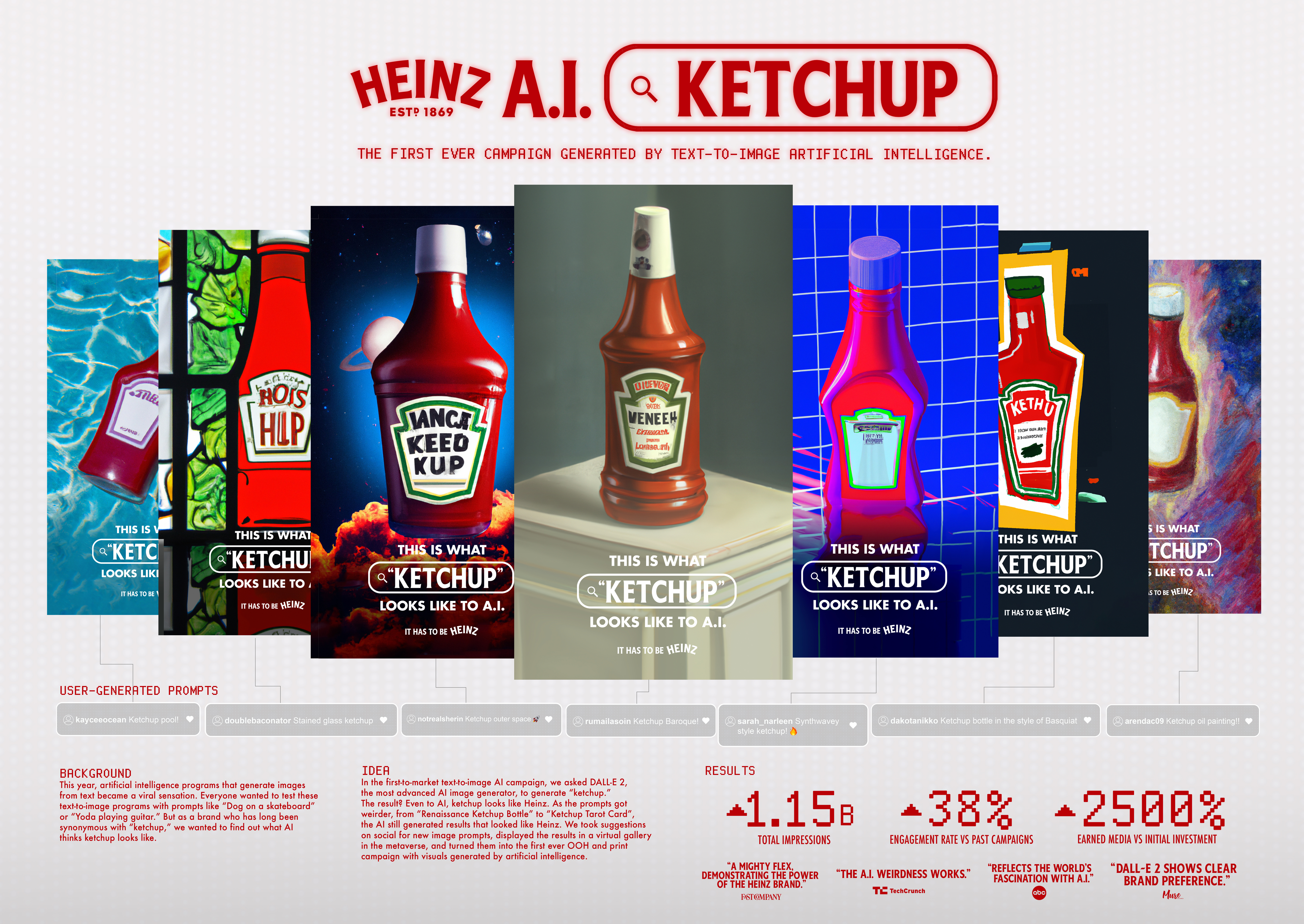 By capitalizing on the text-to-image A.I. trend before any other brand, their first-to-market campaign proved to a younger generation of tech and culture fans that Heinz is THE ketchup. Even the machines agree.