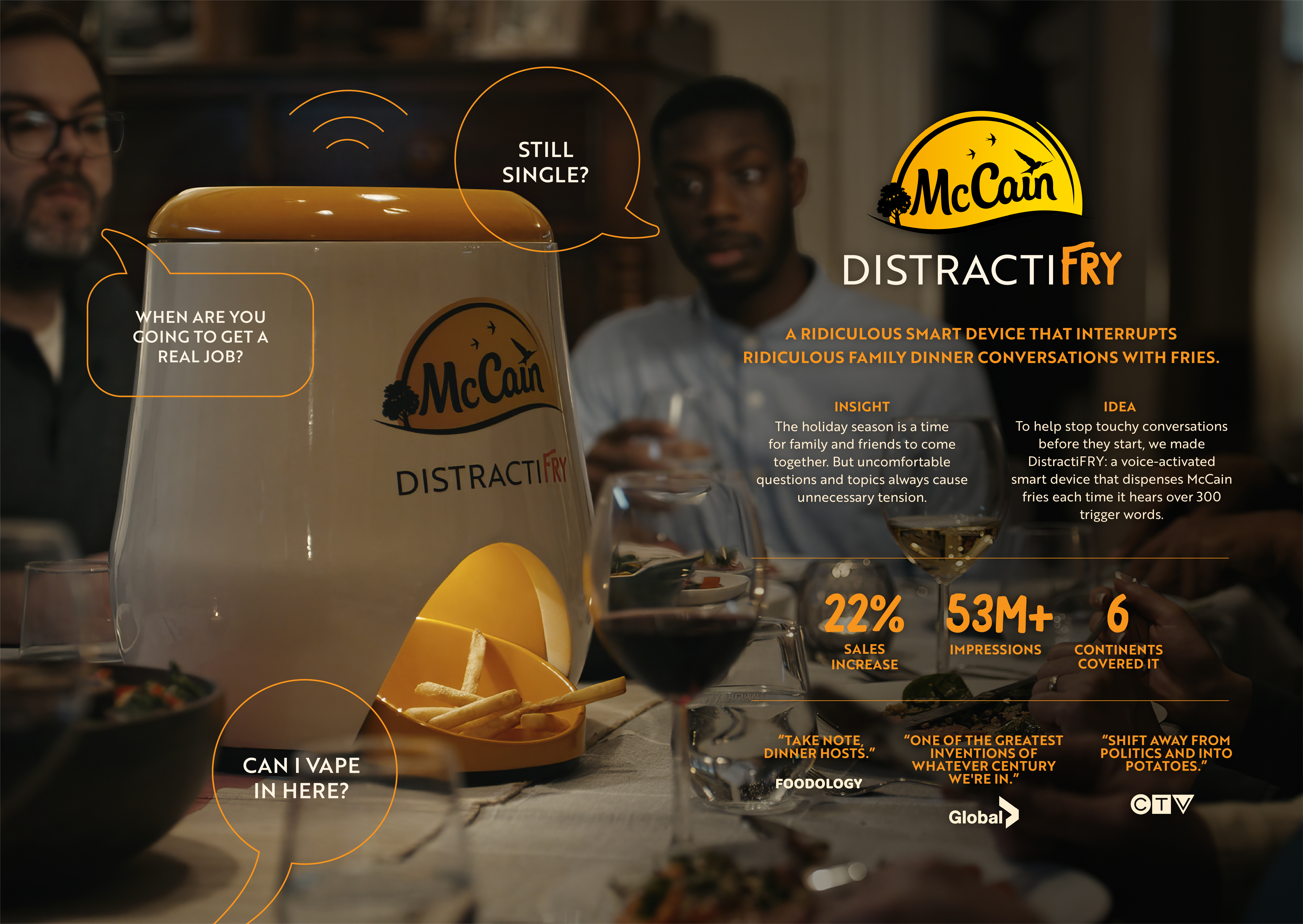 To help their target audience of Canadian families find a universally loved dish to unify everyone during their holiday get-togethers, McCain launched DistractiFRY: a voice-activated device that dispenses hot, crispy McCain fries each time it hears one of over 300 pre-programmed trigger words and phrases (such as “Got a job yet?”, “Who are you voting for?”, and “When are you getting married?”) – phrases that were generated via social listening on the most popular social media platforms.